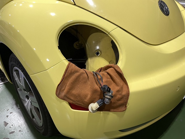 本日はニュービートルの車検整備のご依頼をいただきました。早速初めに行う受入検査をしていると左テールライトが点灯してませんでした。バルブ切れかと思いましたが取り外して確認するとソケット部分が焼けて溶けておりました。。。(汗)点灯しない原因はこれですね。