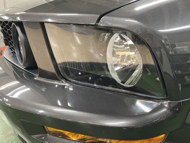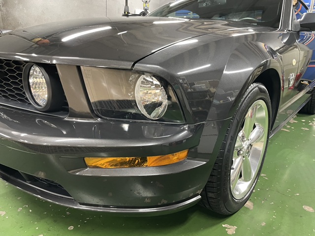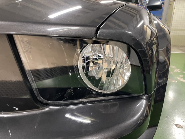本日はマスタングの車検整備からです。遠方より新規ご依頼ありがとうございます。事前に確認していましたので車検整備はスムーズに完成。しかしヘッドライトが経年劣化で表面のクリアがくすんでおりました。本来なら交換レベルでしたが磨いて対応させていただきました。