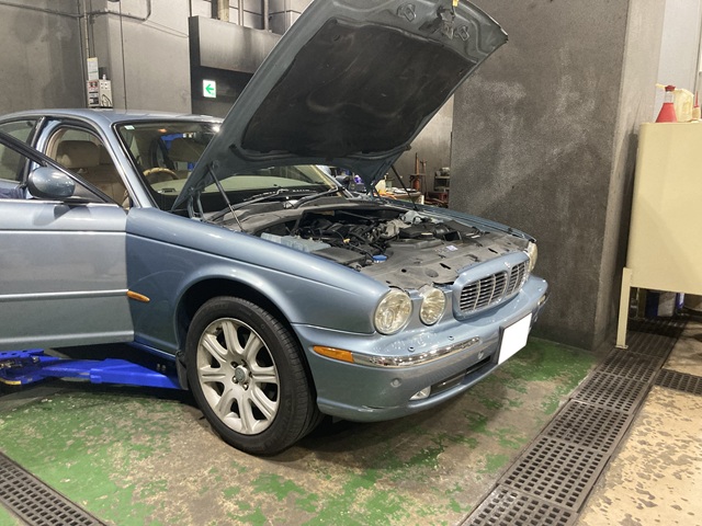 本日は車検整備のご依頼をいただき、XJ-8をお預かりさせていただきました。車検前にNG箇所がないか診断していると、大量のオイル漏れを発見しました。これから深く診断していきますが、エンジンのフロントケースあたりから漏れていそうですね。