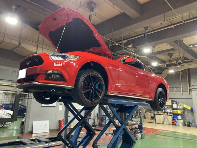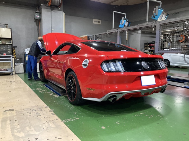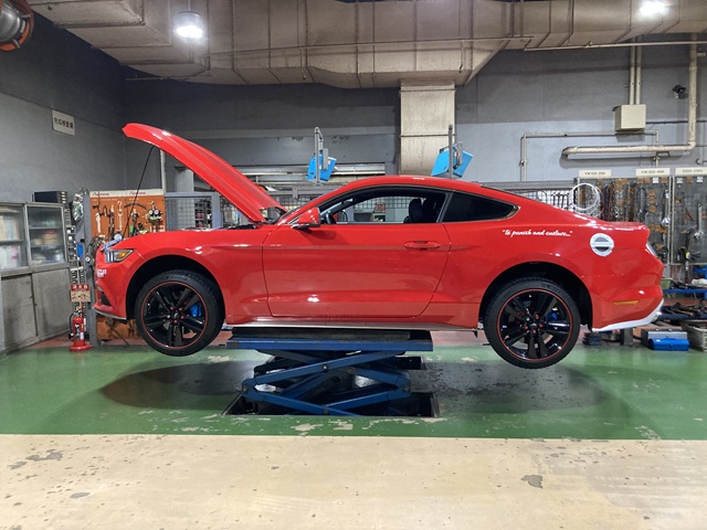 マスタングのオイル交換作業です。いつも遠方よりご来店いただきありがとうございます。今回はオイルエレメントの交換もしていきます。フォード車の整備をする場合、当店ではご指定がなければ基本純正品で交換しております。残念ながらエンジンオイルは日本への供給がございませんので、より高性能なワコーズ ユーロツーリングをご用意しております。