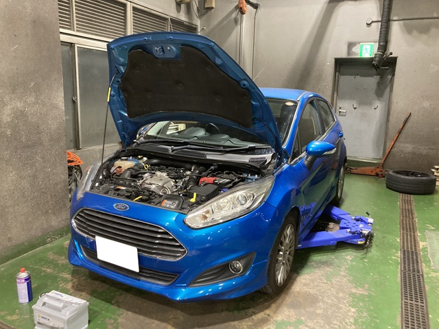 本日はフィエスタのバッテリー交換です。こちらのフィエスタは車検整備でのお預かりとなります。今回はバッテリーも交換させていただきました。